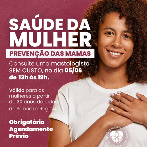 No dia 05/06/2023, das 13h às 19h, a Santa Casa de Sabará estará oferecendo consultas gratuitas para mulheres a partir de 30 anos da cidade de Sabará e Região